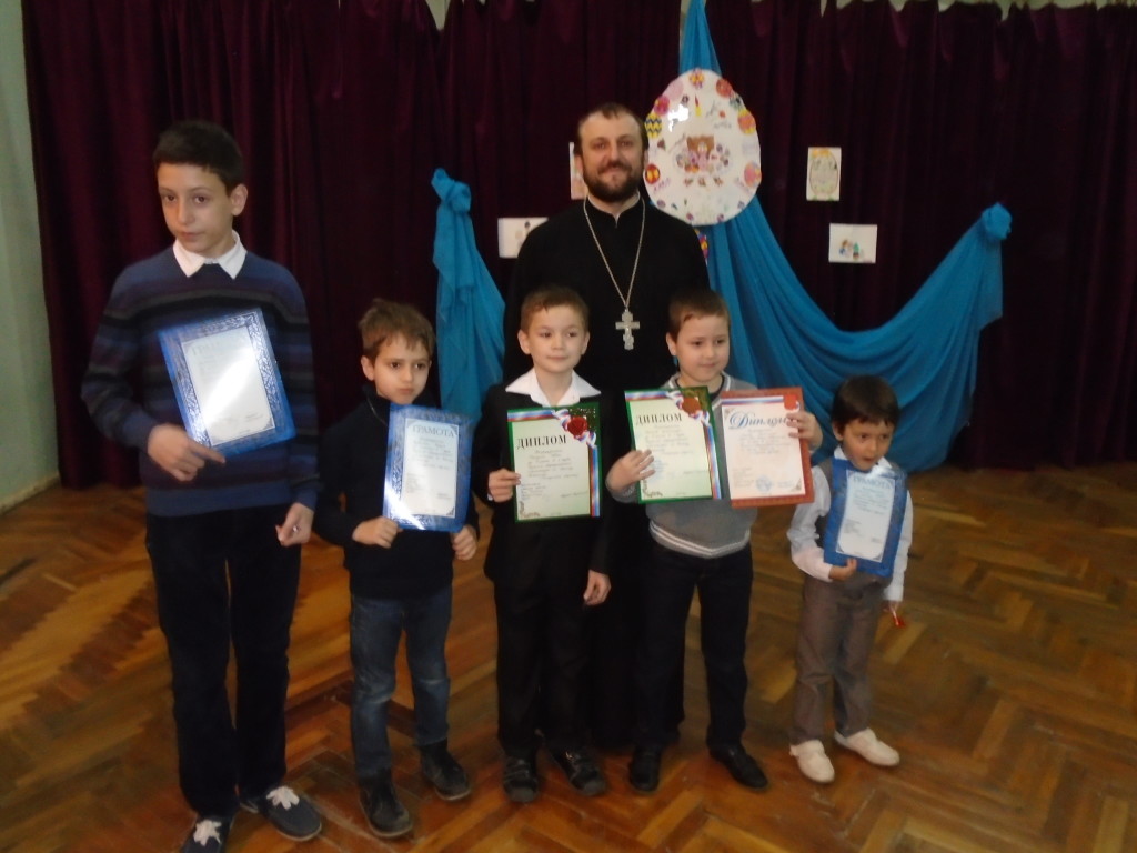 После завершения праздничной программы утренника, иерей Андрей Миронов вручил дипломы и грамоты победителям и участникам первого и второго этапов Кирилло-Мефодиевской олимпиады по Закону Божиему. Затем все пришедшие на утренник дети получили из рук настоятеля Пасхальные подарки.